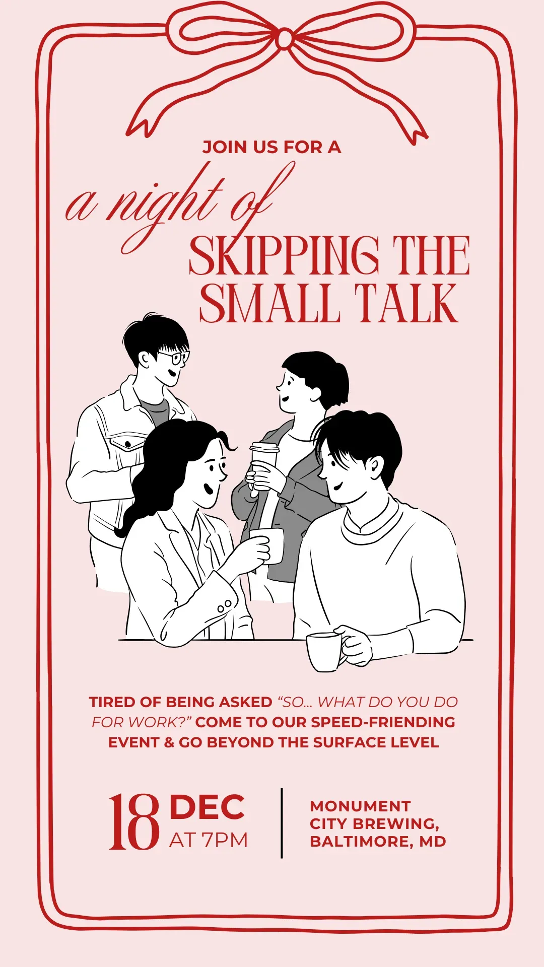 Thursday, Dec. 18th • 6:00 pm - 9:00 pm Thursday, Dec. 18th 6:00 pm - 9:00 pm Skip the Small Talk View Details